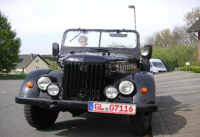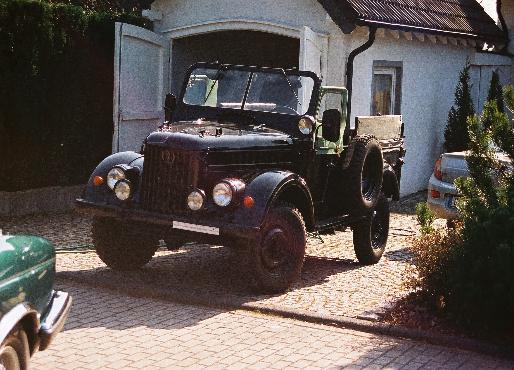 Seit Anfang 1999 habe ich einen GAZ 69 M aus NVA-Armee-Depotbeständen. Das Fahrzeug hat Hinterrradantrieb mit zuschaltbarem Allradantrieb und einem Reduktionsgetriebe. Ich hatte die Auswahl aus Fahrzeugen in Originallackierung und einem schwarzen Fahrzeug. Ich habe mich für das schwarze Auto entschieden. Es wurde von einem Fachbetrieb vorher entsprechend lackiert. Angetrieben wird der GAZ von einem 2,5 l 4 Zylinder Ottomotor (Originalmotor), hat ca 68 PS und soll eine Höchstgeschwindigkeit vom 95 km / h bringen. Der GAZ stammt aus dem Jahr 1967. Ich nutze das Auto nur bei schönem und trockenen Wetter. Daher habe ich mich noch nicht von seiner hervorragenden Geländegängigkeit überzeugen können.